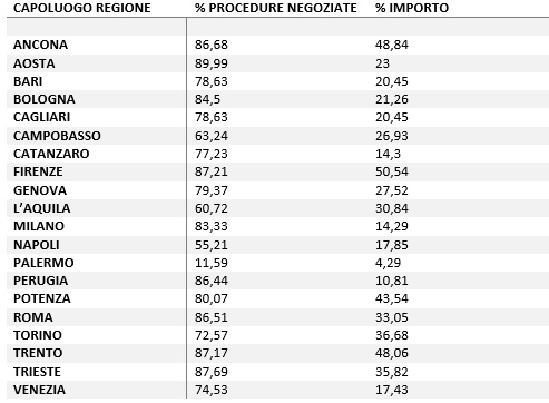 Di seguito l’elenco completo dei dati riferiti ai 20 capoluoghi di Regione, con la percentuale delle procedure negoziate in affidamento diretto anziché con gara rispetto al totale dei lavori e la percentuale che indica la quota dell’importo riferito alle procedure negoziate rispetto all’importo complessivo.