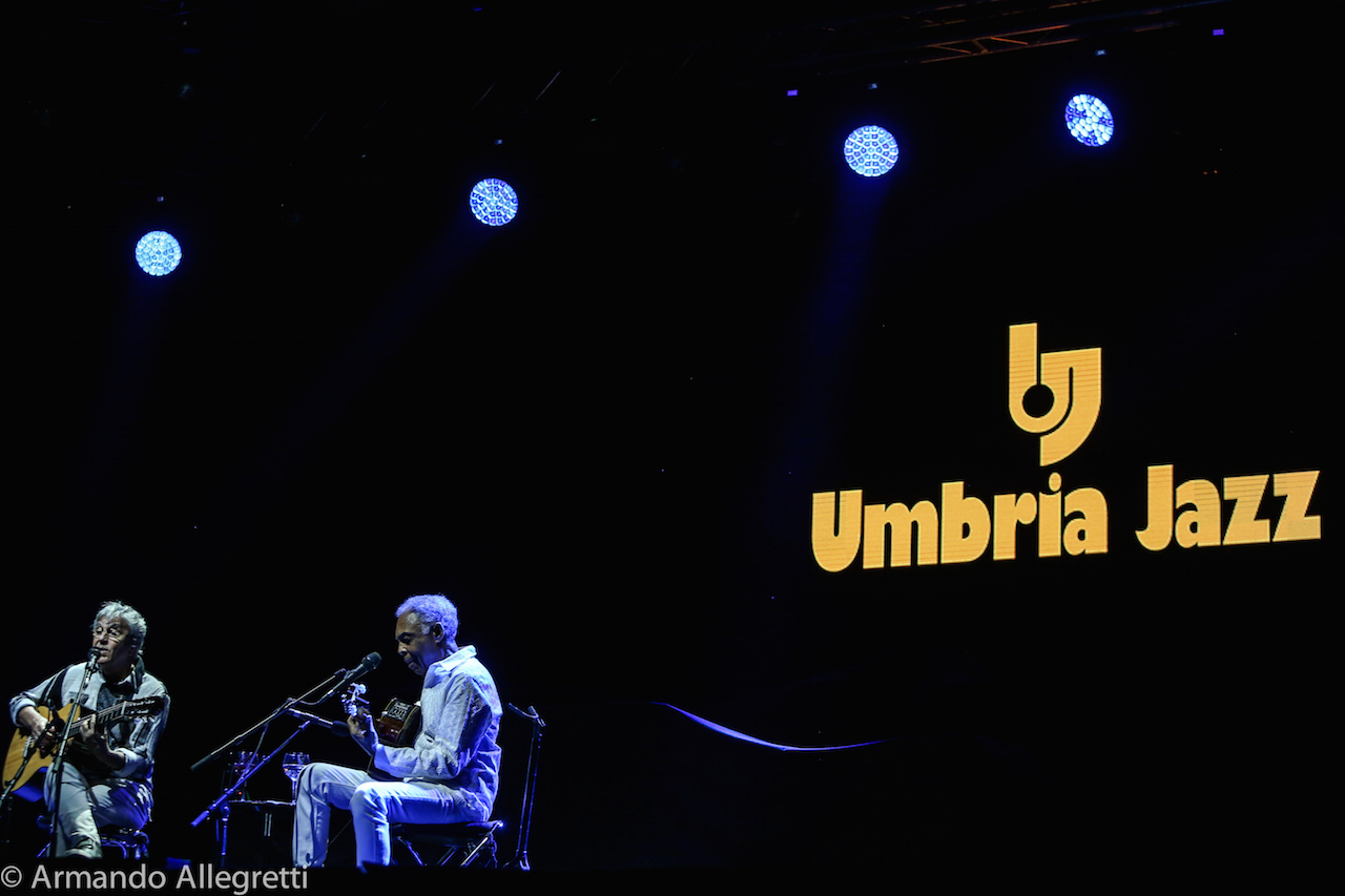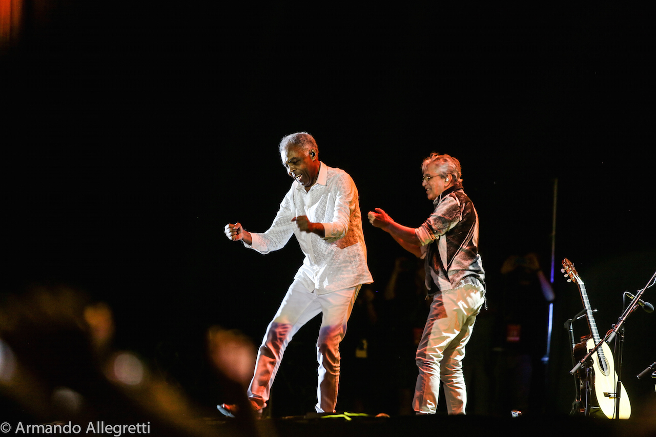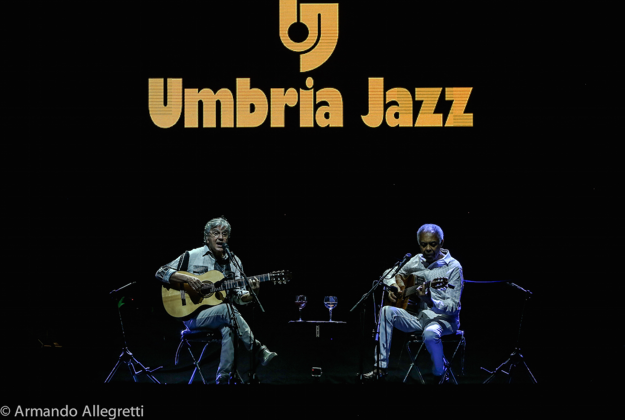 Perugia. Dopo i sold out di Parigi, Londra, Copenaghen, Amsterdam, Caetano Veloso e Gilberto Gil hanno fatto tappa in Italia con il loro “Caetano&Gil-Two Friends, a century of Music”, il tour europeo che vede i due giganti della musica brasiliana insieme a 21 anni dal loro ultimo tour mondiale. L’occasione è anche quella di celebrare i rispettivi 50 anni di carriera. Caetano Veloso e Gilberto Gil si sono incontrati per la prima volta per caso a Salvador (Bahia), e da quel giorno dei primi anni ‘60 sono diventati amici.Sul Palco. Il concerto che Caetano Veloso e Gilberto Gil propongono è completamente inedito, con una scaletta pensata ad hoc, che vede i due artisti insieme sul palco con le loro chitarre per l’intera durata del live. Così va verso la conclusione il weekend di Umbria Jazz, un fine settimana che inizia tingendosi di colori brasiliani con l’attesissima Réunion dei due amici che celebrano anche i cinquanta anni di amicizia tornando ad esibirsi insieme sul palco del Santa Giuliana di Perugia. Più che un concerto è stata una festa con la gente che ha ballato, che ha cantato con loro che davano il ritmo all’onda che si muoveva gioiosa sotto al palco dell’Arena.