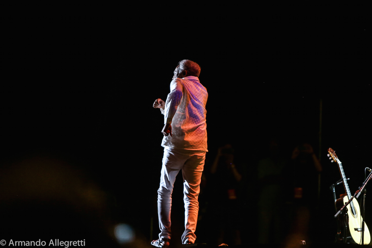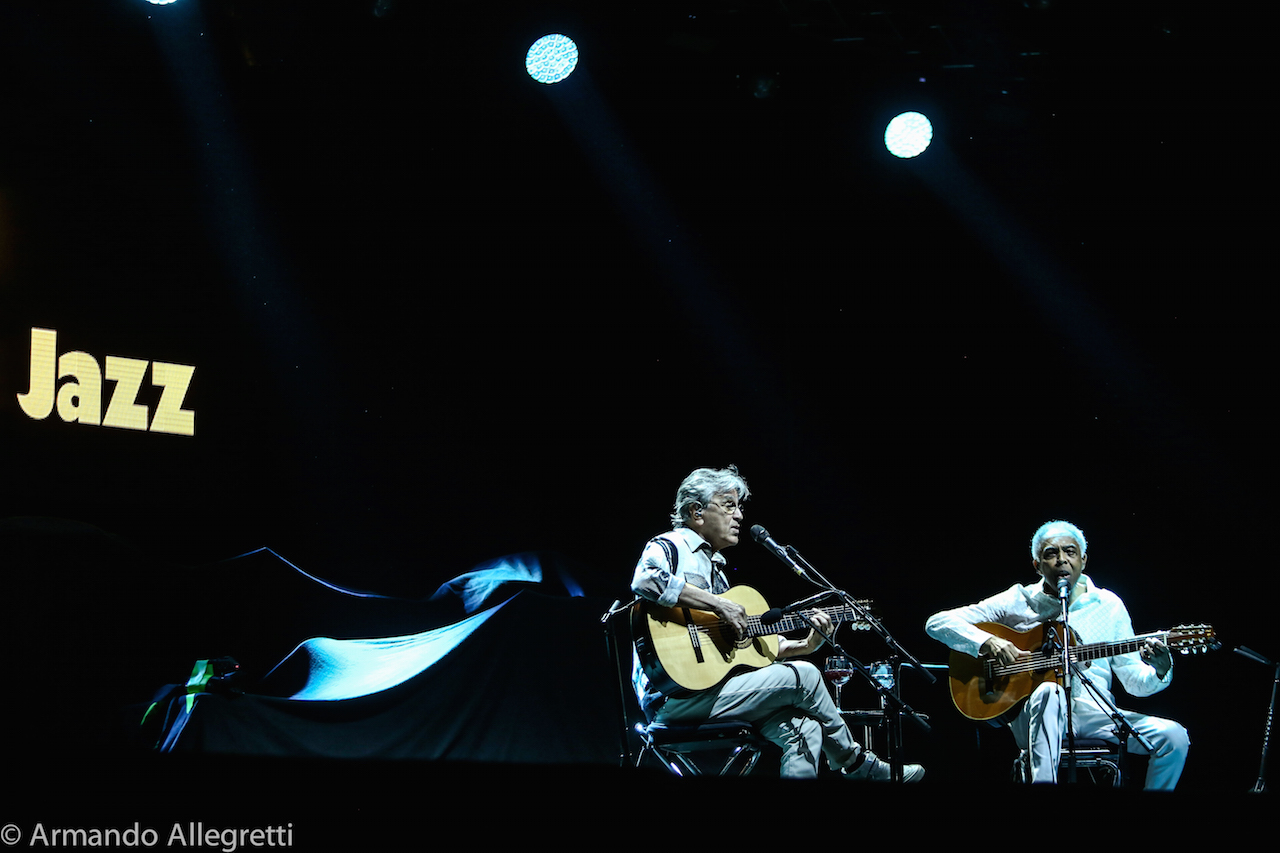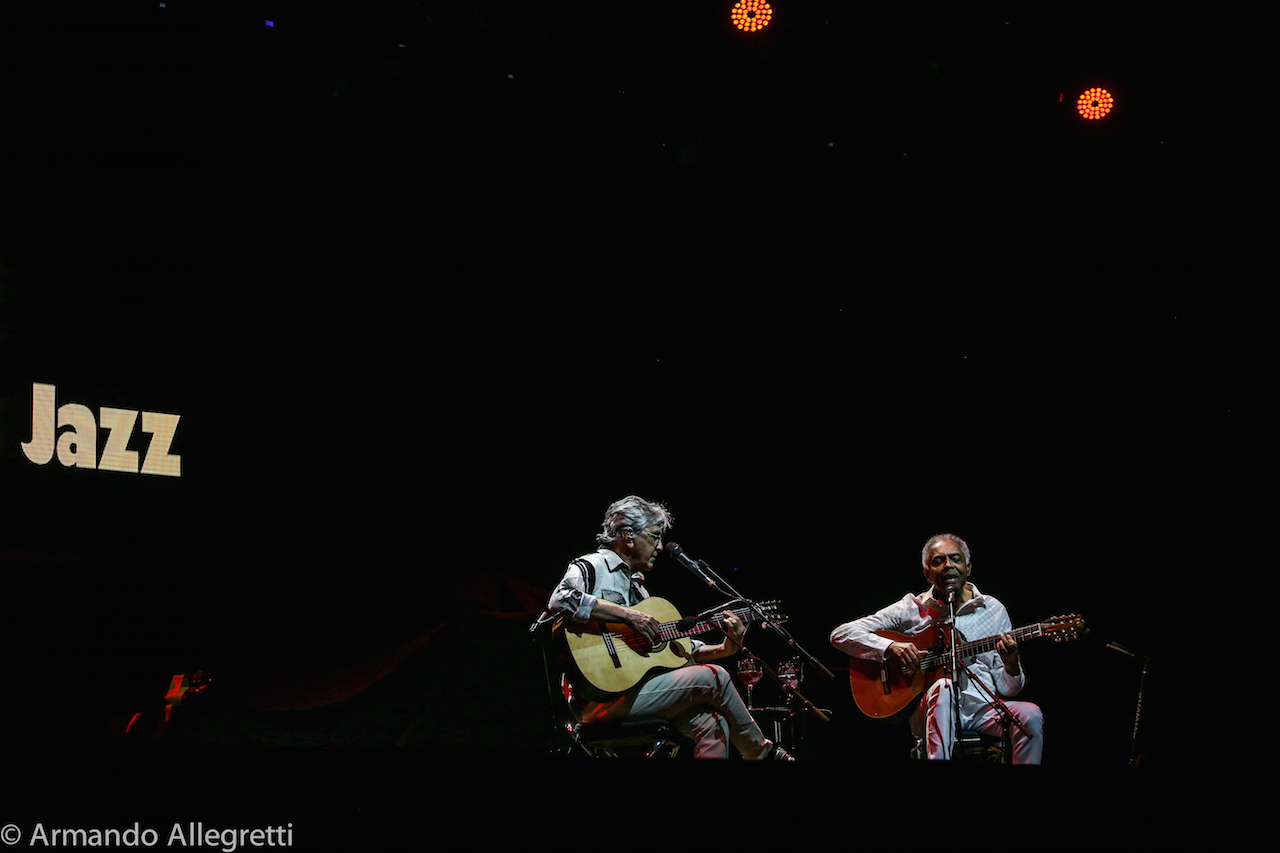 Perugia. Dopo i sold out di Parigi, Londra, Copenaghen, Amsterdam, Caetano Veloso e Gilberto Gil hanno fatto tappa in Italia con il loro “Caetano&Gil-Two Friends, a century of Music”, il tour europeo che vede i due giganti della musica brasiliana insieme a 21 anni dal loro ultimo tour mondiale. L’occasione è anche quella di celebrare i rispettivi 50 anni di carriera. Caetano Veloso e Gilberto Gil si sono incontrati per la prima volta per caso a Salvador (Bahia), e da quel giorno dei primi anni ‘60 sono diventati amici.Sul Palco. Il concerto che Caetano Veloso e Gilberto Gil propongono è completamente inedito, con una scaletta pensata ad hoc, che vede i due artisti insieme sul palco con le loro chitarre per l’intera durata del live. Così va verso la conclusione il weekend di Umbria Jazz, un fine settimana che inizia tingendosi di colori brasiliani con l’attesissima Réunion dei due amici che celebrano anche i cinquanta anni di amicizia tornando ad esibirsi insieme sul palco del Santa Giuliana di Perugia. Più che un concerto è stata una festa con la gente che ha ballato, che ha cantato con loro che davano il ritmo all’onda che si muoveva gioiosa sotto al palco dell’Arena.