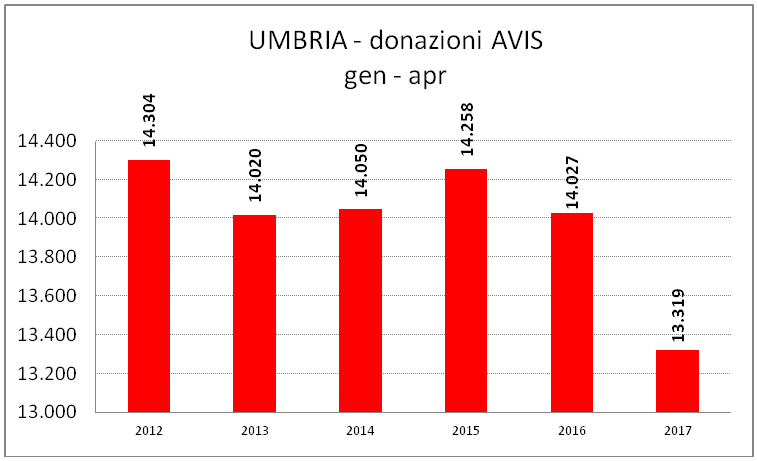 “È urgente individuare – fanno sapere da Avis Umbria – le cause della costante diminuzione delle donazioni e proporre idonei strumenti e iniziative capaci di invertire l’attuale tendenza. Tutte le componenti del servizio dovranno essere impegnate, dall’assessorato regionale competente ai direttori generali delle Aziende sanitarie e ospedaliere, dagli operatori dei servizi all’associazione”. La carenza che persiste ormai da oltre 18 mesi spesso, infatti, si avvicina all’emergenza. Ad aprile i donatori Avis hanno effettuato meno di 3mila donazioni. Non si registrava un dato così basso dal luglio 2008. Ma tutto il primo quadrimestre del 2017 si è chiuso con il segno negativo: meno 5,06 per cento rispetto allo stesso periodo del 2016 e cioè meno 710 donazioni avisine e meno 1.400 donazioni rispetto a quelle programmate.