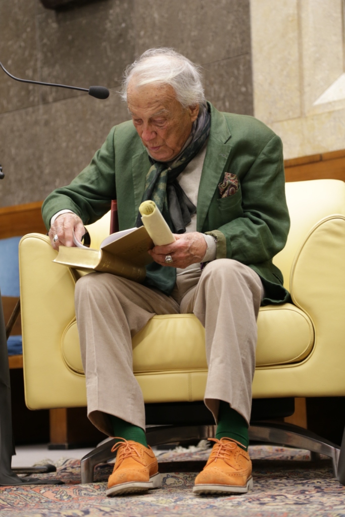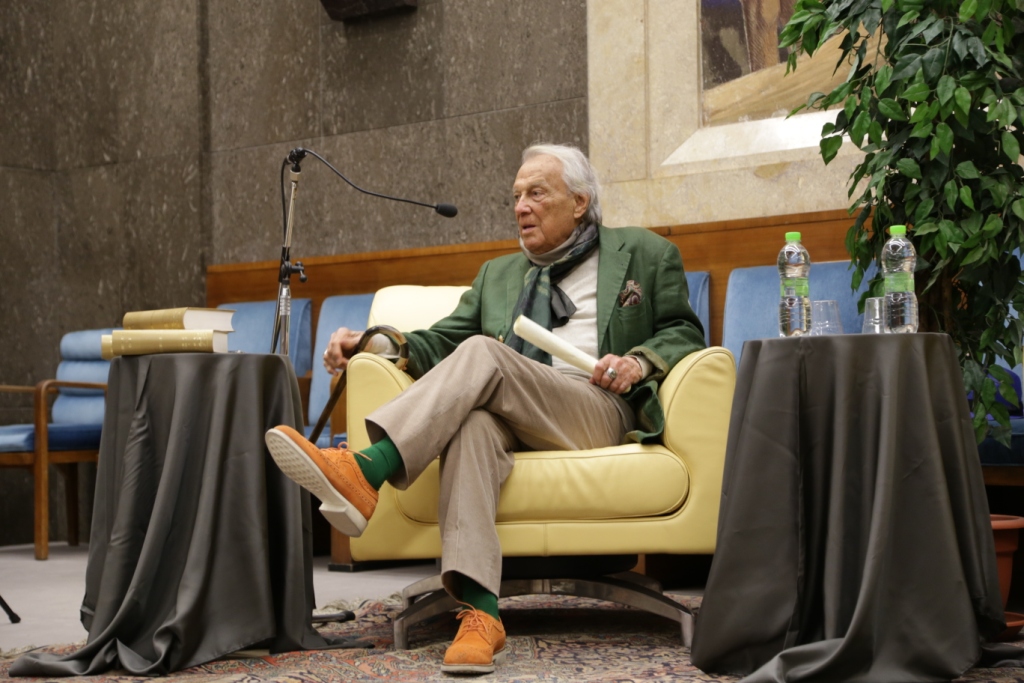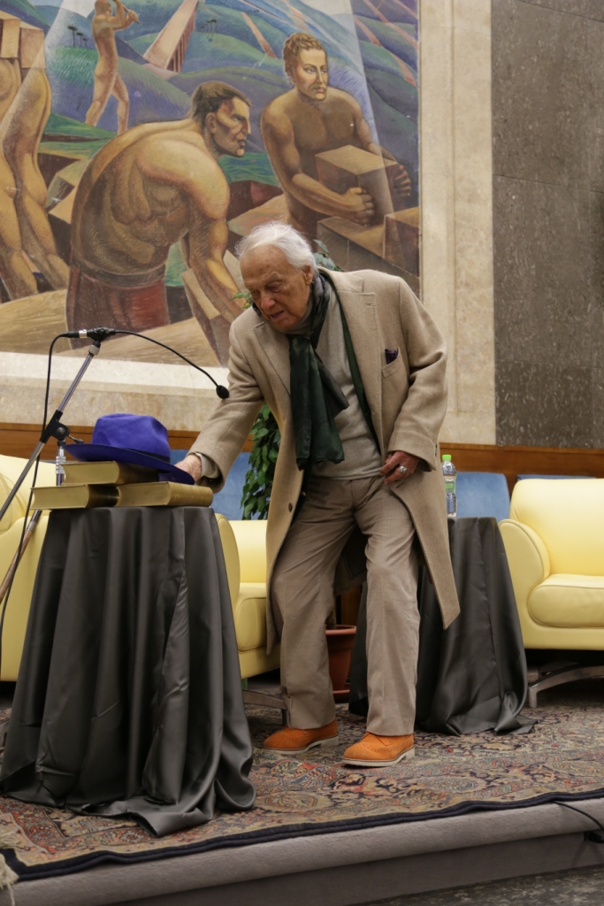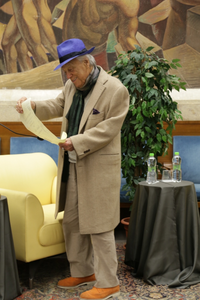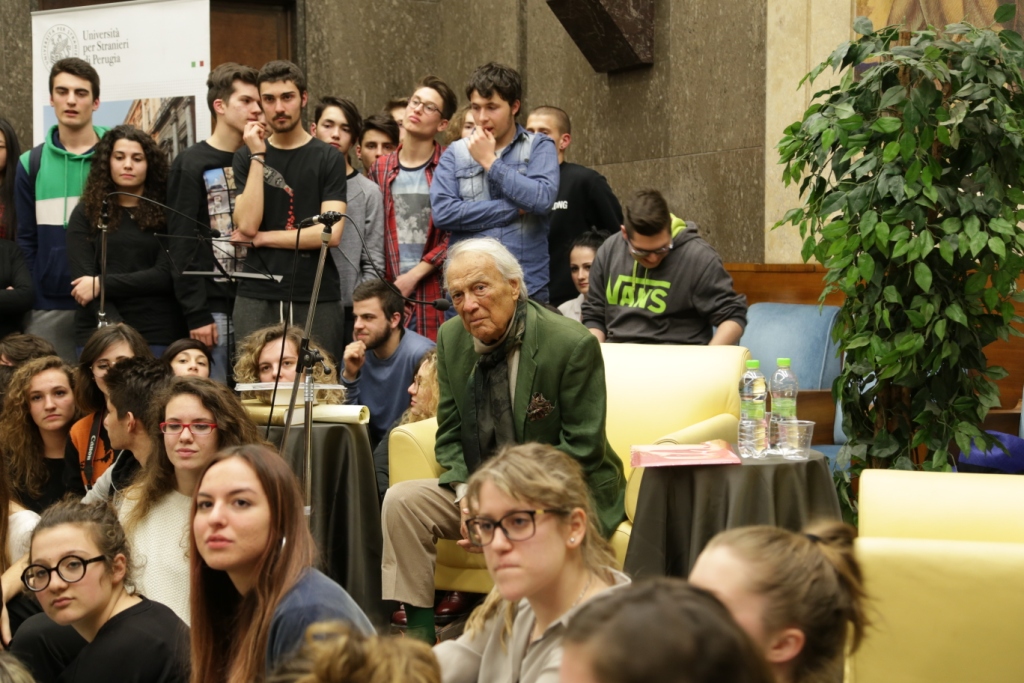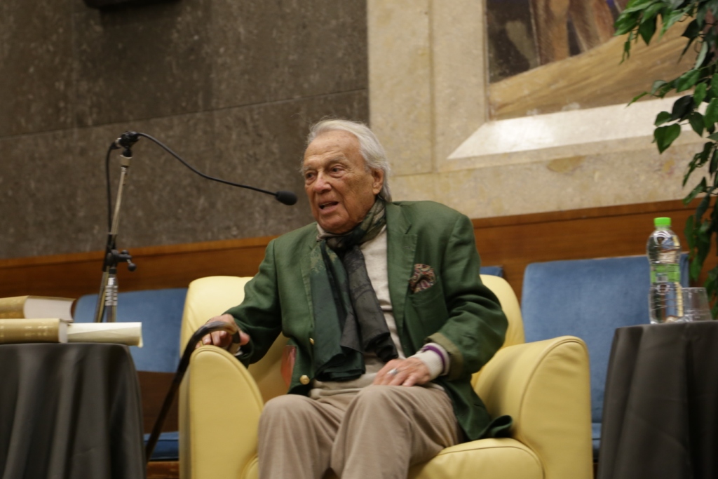 L’intervista – Presentato da Teresa Severini e intervistato da Bruno Taburchi, Albertazzi parla di teatro, della sua vita e di quella di altri attori attraverso una serie di aneddoti che permettono anche di comprendere meglio cosa sia l’arte. Dichiara: “non esiste l’attore bravo o meno bravo; l’arte del teatro è essere il personaggio e non fare il personaggio”. Taburchi aiuta la platea a ripercorrere i momenti salienti della carriera del maestro, poi gli lascia molto spazio e Albertazzi non manca di condividere ironicamente anche i suoi limiti umani: “Sono un uomo in fuga. Scappo sempre dalle persone che mi vogliono bene”. Uomo di cultura, carisma e simpatia ha conquistato tutti e lui si è lasciato conquistare dalla presenza in sala di una rappresentanza di studenti provenienti dalle Marche e li ha invitati a sedere avanti, intorno a lui. Alla fine dell’intervista scopriamo che il personaggio shakespeariano femminile che più lo affascina è Cleopatra, perché padrona del mondo, regina del Nilo e, prendendo spunto da una domanda postagli sul futuro del teatro sottolinea che, a differenza di quanto si possa immaginare, esso non è stato sostituito dall’interesse per la televisione o del cinema; statistiche rivelano, al contrario, che le sale del teatro si riempiono più degli stadi. Una ricerca ha dimostrato, inoltre, che quando la società vive un momento di crisi, come quello che stiamo sperimentiamo negli ultimi anni, il teatro si riempie, è una forma di compensazione e tocca nel profondo.