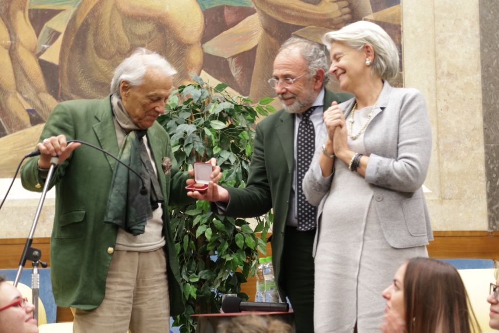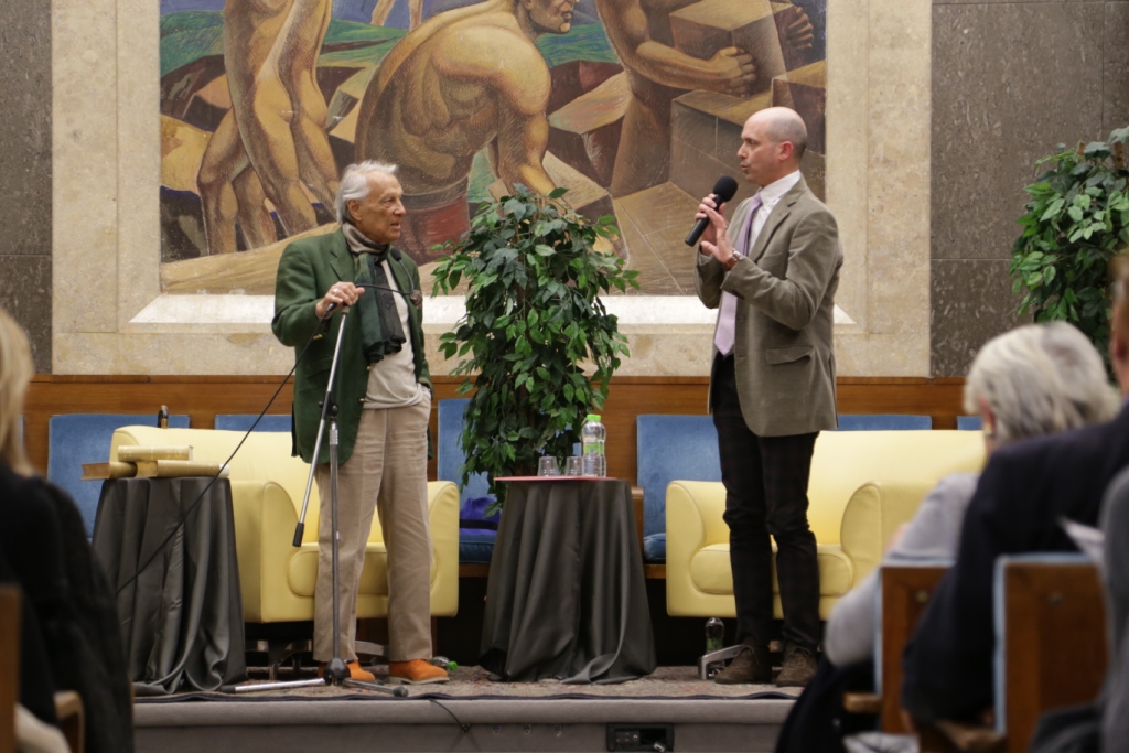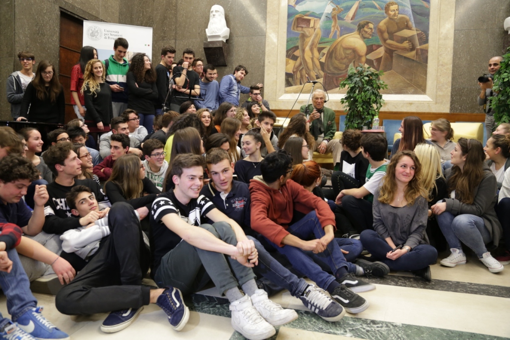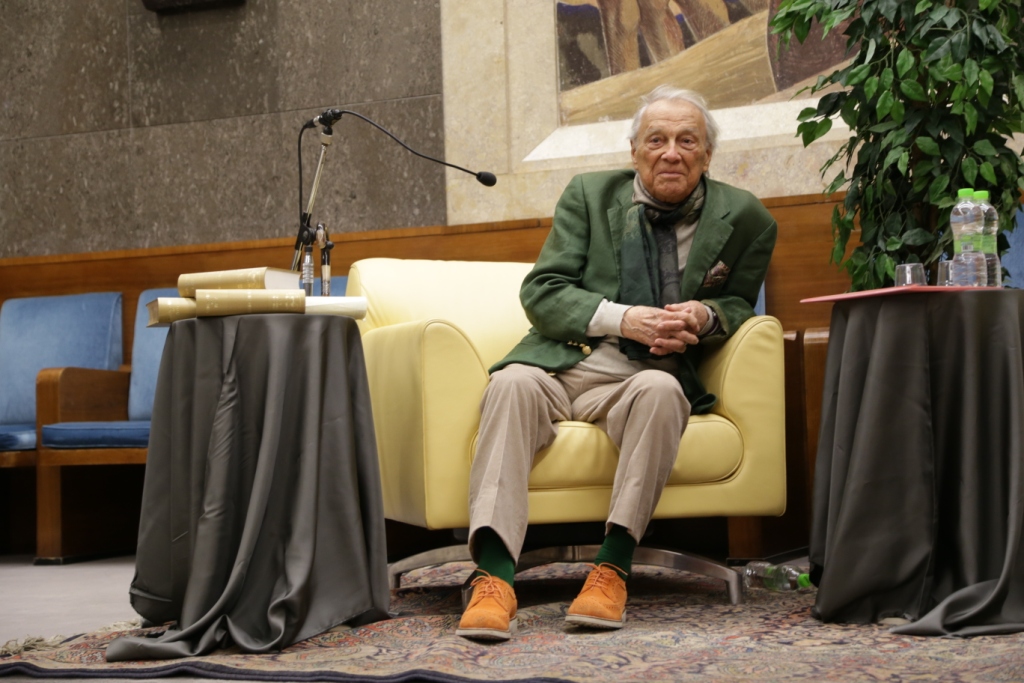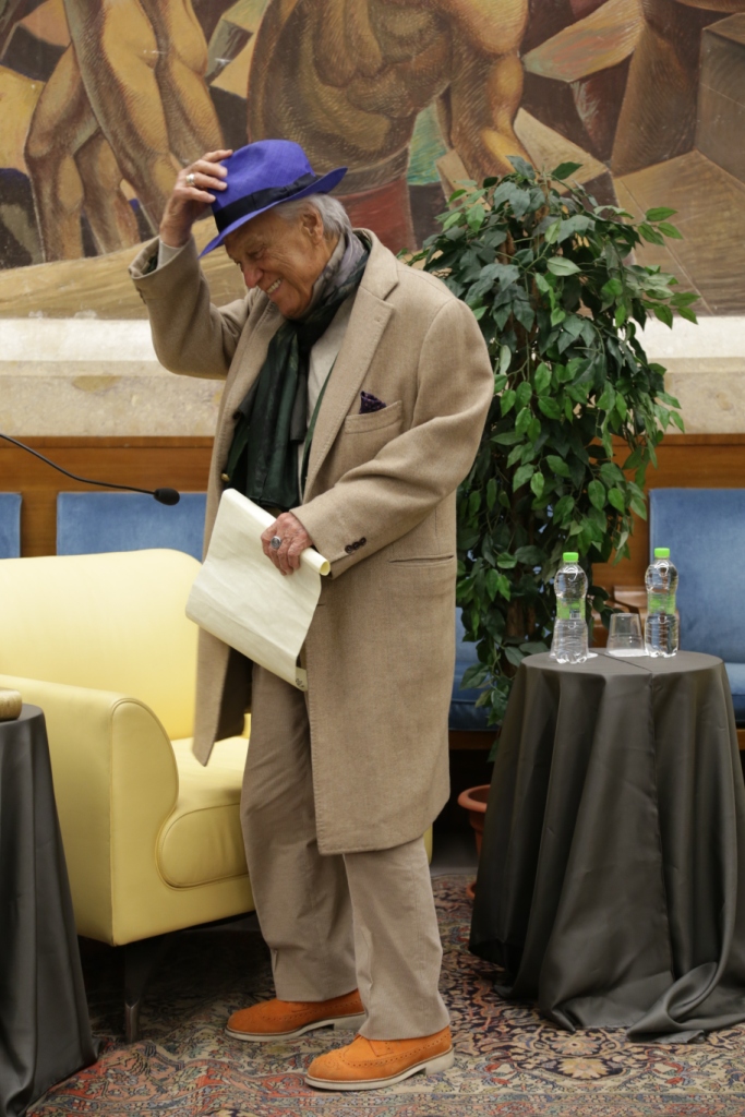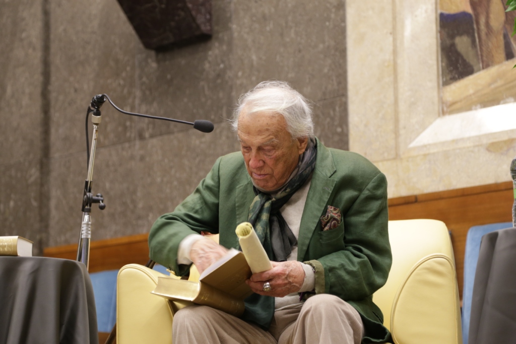 L’intervista – Presentato da Teresa Severini e intervistato da Bruno Taburchi, Albertazzi parla di teatro, della sua vita e di quella di altri attori attraverso una serie di aneddoti che permettono anche di comprendere meglio cosa sia l’arte. Dichiara: “non esiste l’attore bravo o meno bravo; l’arte del teatro è essere il personaggio e non fare il personaggio”. Taburchi aiuta la platea a ripercorrere i momenti salienti della carriera del maestro, poi gli lascia molto spazio e Albertazzi non manca di condividere ironicamente anche i suoi limiti umani: “Sono un uomo in fuga. Scappo sempre dalle persone che mi vogliono bene”. Uomo di cultura, carisma e simpatia ha conquistato tutti e lui si è lasciato conquistare dalla presenza in sala di una rappresentanza di studenti provenienti dalle Marche e li ha invitati a sedere avanti, intorno a lui. Alla fine dell’intervista scopriamo che il personaggio shakespeariano femminile che più lo affascina è Cleopatra, perché padrona del mondo, regina del Nilo e, prendendo spunto da una domanda postagli sul futuro del teatro sottolinea che, a differenza di quanto si possa immaginare, esso non è stato sostituito dall’interesse per la televisione o del cinema; statistiche rivelano, al contrario, che le sale del teatro si riempiono più degli stadi. Una ricerca ha dimostrato, inoltre, che quando la società vive un momento di crisi, come quello che stiamo sperimentiamo negli ultimi anni, il teatro si riempie, è una forma di compensazione e tocca nel profondo.