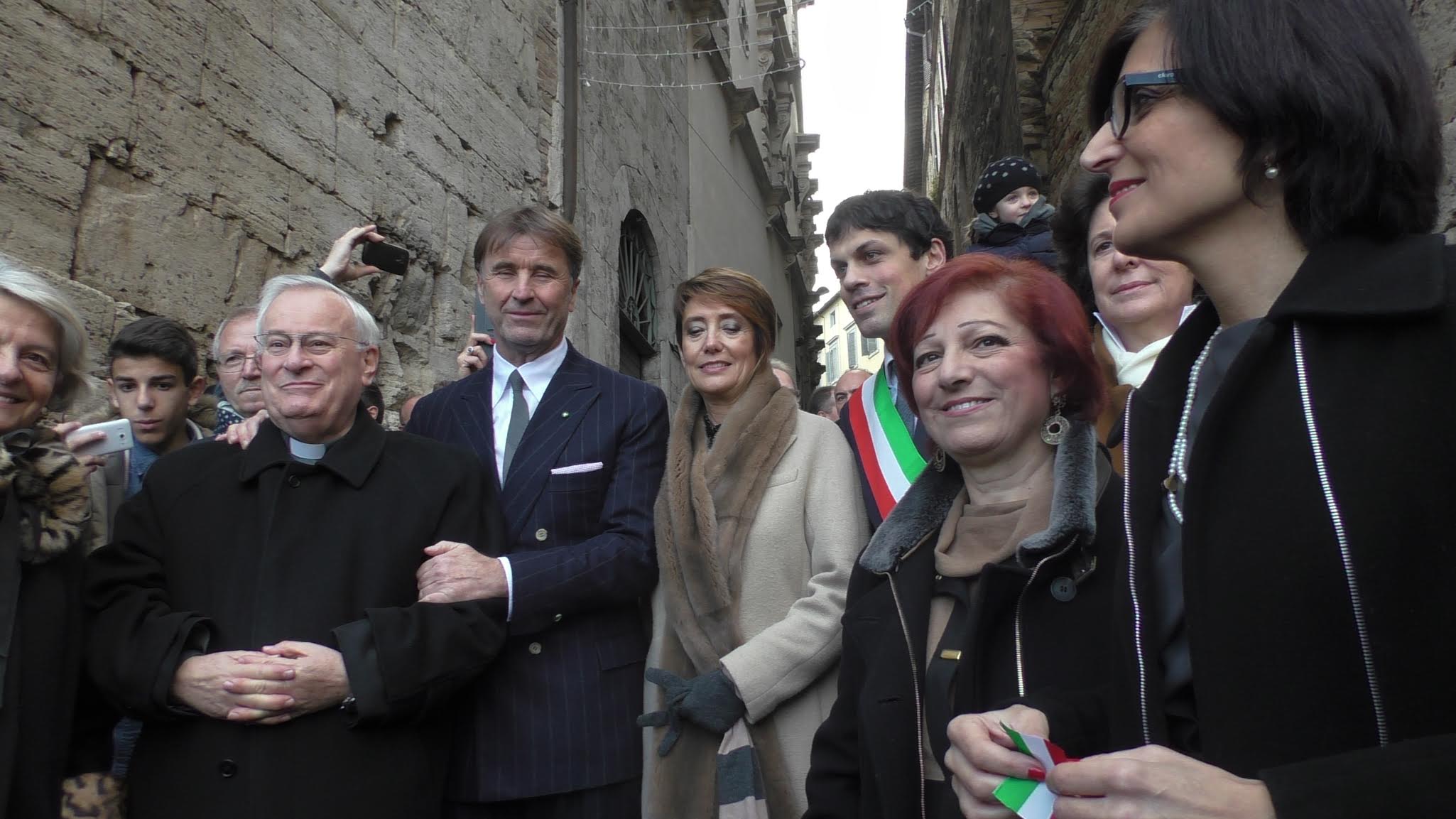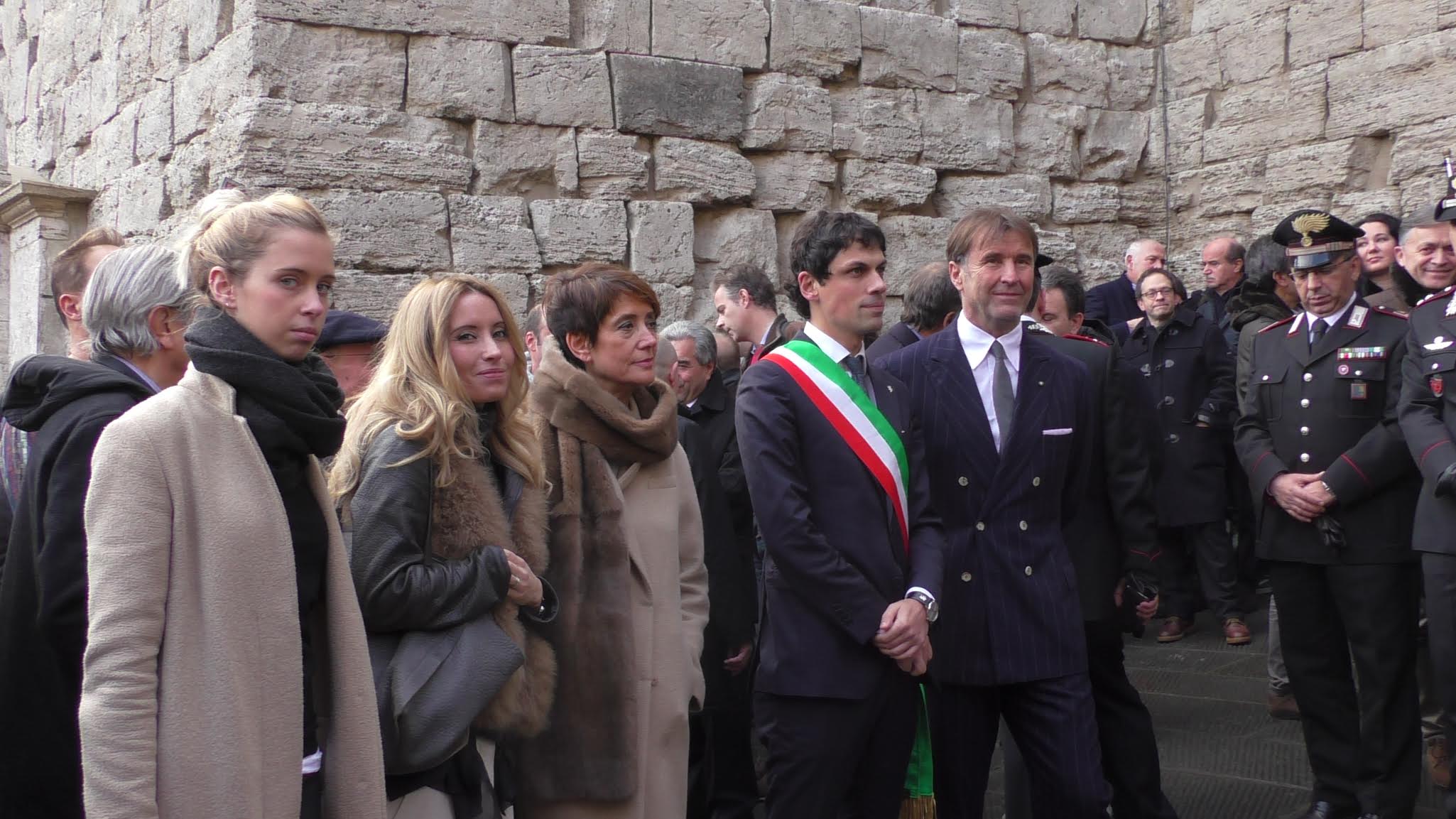 La consegna dei sigilli a Cucinelli – Subito dopo, in una cerimonia che si è svolta nella Sala dei Notari, il sindaco Romizi ha consegnato i sigilli della città a Brunello Cucinelli che con un finanziamento di 1,3 milioni di euro ha reso possibile l’intervento, e che oggi ha annunciato che finanzierà anche il restauro delle mura laterali.