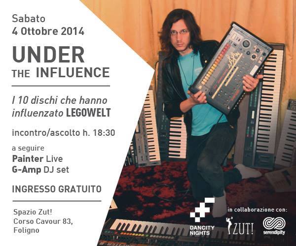 Oltre alla performance notturna, per i cultori dell’elettronica, è previsto un incontro/ascolto lo stesso 4 ottobre alle 18:30, presso il teatro dello Spazio ZUT in Corso Cavour, 83 (Foligno). L’evento si intitola under the influence e sarà lo stesso Legowelt a parlare dei 10 dischi che più lo hanno influenzato la sua carriera di musicista.