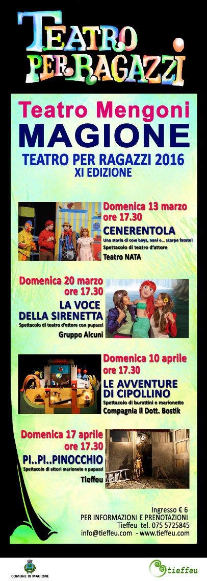 Magione.  Il teatro Mengoni di Magione apre le porte ai più piccoli con la nuova stagione del Teatro ragazzi 2016 curata da Tieffeu. Quattro gli spettacoli in programma che, come le edizioni precedenti, vedono proposte in scena tutte le diverse tecniche teatrali. Dal teatro d’attore all’utilizzo di burattini, marionette, pupazzi e meccanismi, per raccontare un meraviglioso mondo della fantasia che prende ispirazione da cartoni animati, fiabe, libri.