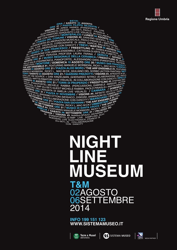 Night Line Museum si propone di trasformare i musei della rete in luoghi di aggregazione per i giovani compresi tra i 18 e i 35 anni di età, attraverso l’organizzazione di una serie di eventi che possano incontrare i loro gusti. Il progetto consiste nella realizzazione di un appuntamento performativo per ognuno dei musei appartenenti alla rete di Terre & Musei dell’Umbria, coinvolgendo Dj, musicisti, video artisti, performer, coreografi.