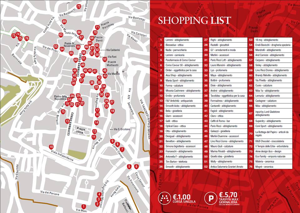 Partecipano in Corso Vannucci, Piazza IV Novembre e Piazza Danti: Andrei, Antonella F, B&B chocolat, Benetton, And Camicie, Bottega del papiro, Bottini, Brandy Melville, Cantarelli, Desigual, Dixie, F&F Antichità, Fagioli, G7 arredamenti e moda, Gioello Idea, Golden point, Lino Ricci donna, Marina Rinaldi, Paris Ricci, Pull love, Rastelli, Simona, Superdry, Tim Barton, Wally. Tra via Danzetta, via Fani, via Mazzini e Via Calderini: Carpano, Castagner, Cuoio, Galeazzi, Lemuria, Lino ricci uomo, Merlini, Sisley, Tavolidea, Via Pinella. In via Baglioni e Piazza Italia: Galli, Glam, Laura Mancini, Lys, Emilio, Merlini, Mivania, Smooth Kicks; in via Oberdan: Lu by Lu, Optical Caso, Paris Ricci Loft, Righi, Franceschi, Smooth; in Via Maestà delle Volte e Via Baldeschi: Coni Sport, Lord Gladstone, Niba, Niba 1A, Tempio delle erbe. Ancora in piazza Matteotti: Antica salumeria Granieri Amato, Caffè di Roma, Claro, Formadress, Mauro Giuli e Maya. Le attività interessate tra via Bonazzi e Viale indipendenza: Otto, Belia, Forma, Kosmo; tra corso Cavour, Borgo XX giugno e Via Marconi: Aisa Shop, Corso Cavour 58, Dinter, Lemmi, Mania sport, Nadia Parrucchieria, Ottica Biessedue, Parafarmacia di Corso Cavour.