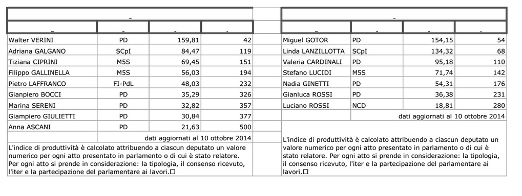 Gotor il più produttivo – Al Senato in testa c’è Miguel Gotor (Pd), con 154.15, medaglia d’argento a Linda Lanzillotta (Scelta civica), 134.32, terza Valeria Cardinali con 95.18. Quarto nella squadra umbra Stefano Lucidi (M5S), 71.74, poi i democratici Nadia Ginetti e Gianluca Rossi, con 54.31 e 36.38. In coda Luciano Rossi (Ncd) con 18.81.