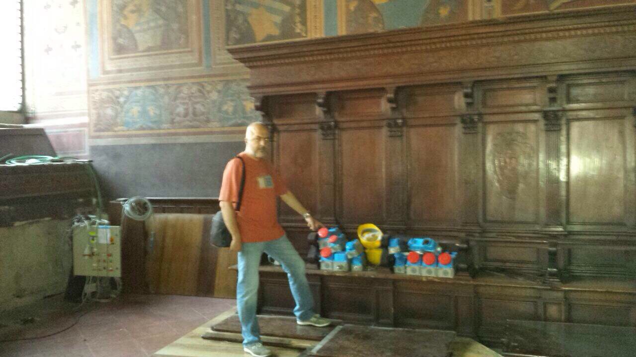 La denuncia del M5S – A denunciare la situazione è il consigliere comunale del M5S Michele Pietrelli, che ieri ha visitato la sala dei Notari a Palazzo Priori e ha deciso di testimoniare lo stato di abbandono e incuria del luogo. La cosa che più sconvolge sono le pesanti attrezzature da manovale, appoggiate sulle panche di legno del coro (quelle posto in fondo alla sala, sotto la volta) senza alcun tipo di copertura o protezione. “Sulle panche – spiega il consigliere Pietrelli -, a caratteri cubitali campeggia la scritta “vietato sedersi” ma qui sopra, tra la polvere, è stato appoggiato di tutto”. Ed in effetti, alcune delle panche usate come da appoggio, appaiono visibilmente deteriorate e piene di vistosi segni, riconducibili forse ai recenti lavori di manutenzione o semplicemente al tempo.