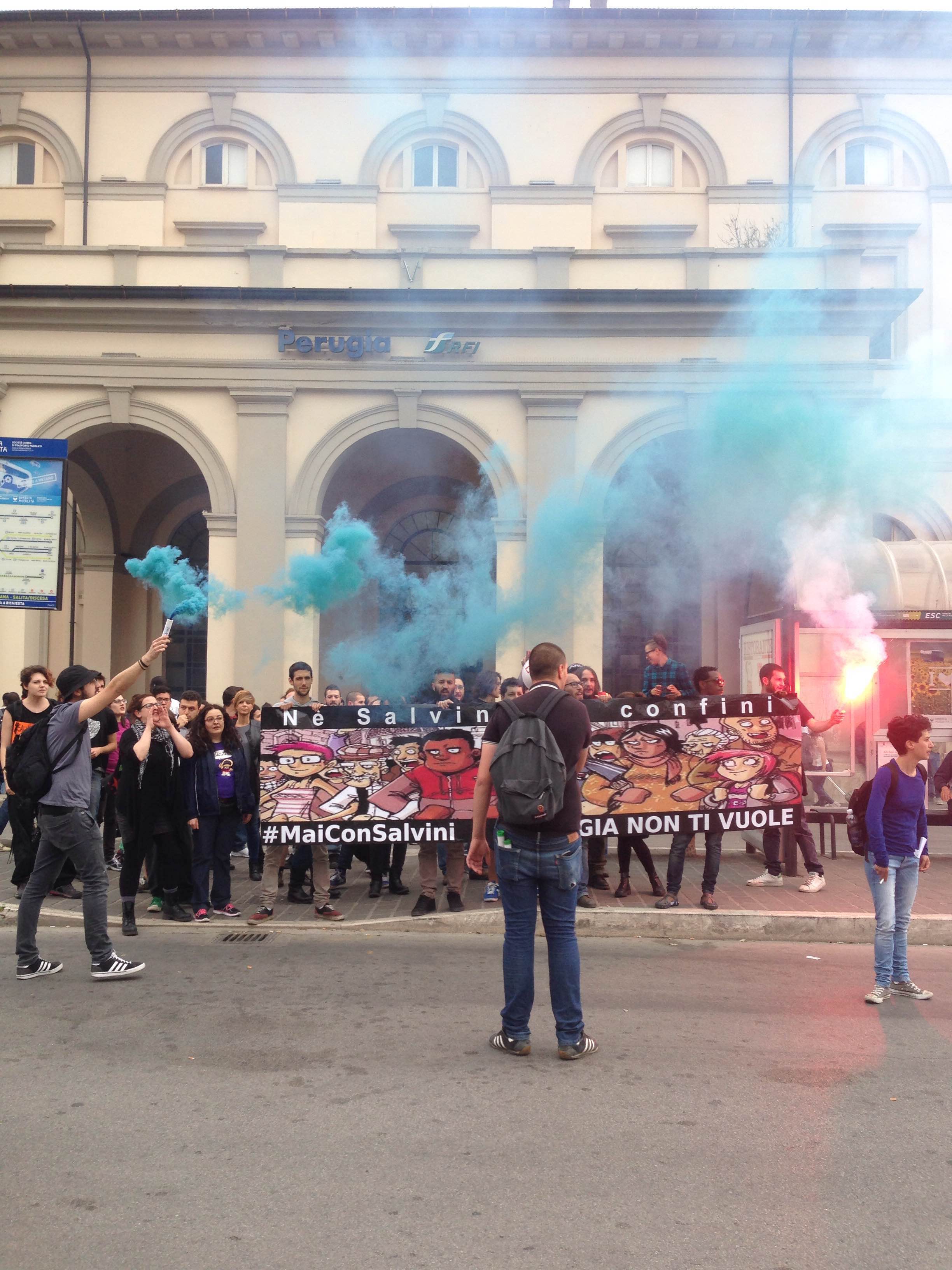 Il corteo #MaiconSalvini – La manifestazione contro il suo comizio è stata organizzata da alcuni giorni dai giovani di sinistra. Si sono ritrovati già alle ore 16 in via del Macello, dietro la stazione. Uno striscione “Mai con Salvini, Perugia non ti vuole” e un megafono per dire no al razzismo e alle politiche xenofobe. Già alle 18 partono tutti e si dirigono verso il luogo in cui, mezz’ora dopo arriverà Salvini. Da una parte loro, coi megafoni e gli striscioni. Dall’altra parte, anche loro dietro alle transenne, i sostenitori del partito che fu di Umberto Bossi. Fischi e cori contro offese, urla e qualche saluto romano. A manifestare contro l’arrivo di Salvini a Perugia, però, non ci sono solo i centri sociali, quelli che Salvini definisce “zecche”. Un botta e risposta da dietro le transenne, come a una partita di calcio. Da un lato le urla dall’altro gesti offensivi e prese in giro.