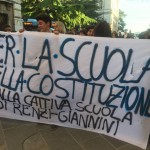 Insegnanti e alunni si sono ritrovati in piazza IV Novembre dove sulla ringhiera della fontana Maggiore è stato esposto un lenzuolo con la scritta colorata “No ad una riforma che umilia la scuola".